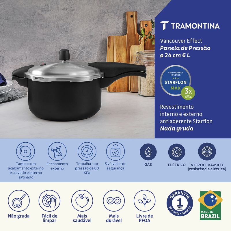 CozinhaOutrosPanelasPanela de Pressão Vancouver Effect em Alumínio com Revestimento Interno e Externo em Antiaderente Starflon Max Preto 24 cm 6 L - Tramontina